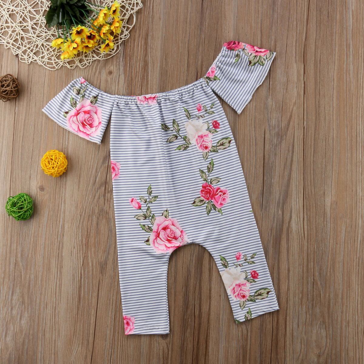 新作 フラワーベイビーガールズ幼児生まれのベイビーガールオフショルダーストライプロンパースジャンプスーツサマーカキュアルベイビーガールズ服