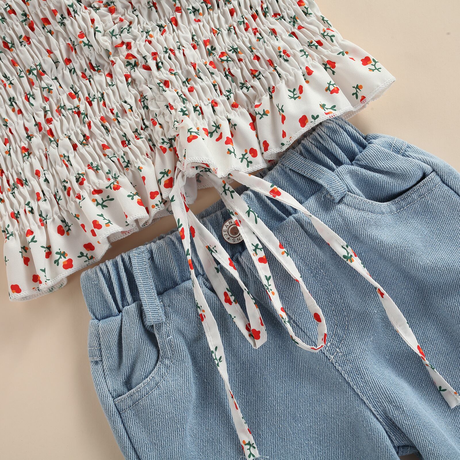 新作 Ma&Baby1-6Yフラワーキッドガール洋服セット子供服パフスリーブクロップトップデニムパンツsDD15