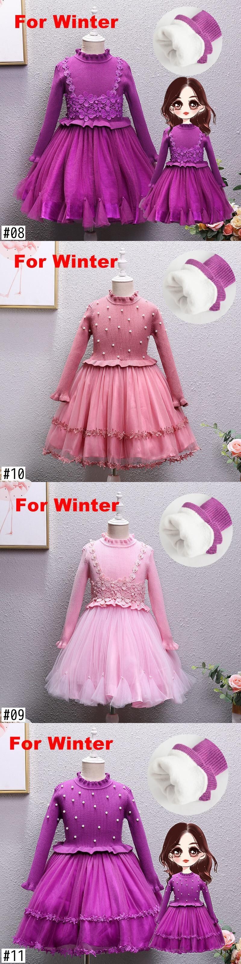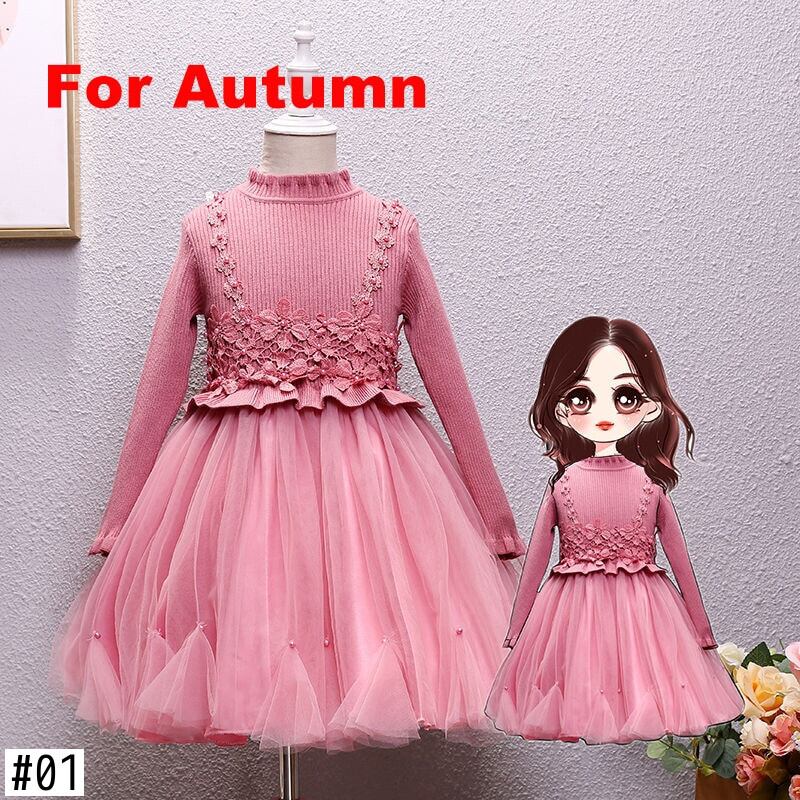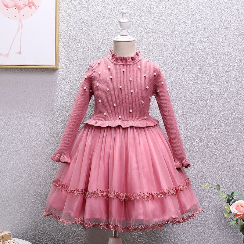 新作 子供用リブコットンガールニットビーズティーンガールの長袖フローラルチュール生地ドレス45 6 7 8 9 10 1112年