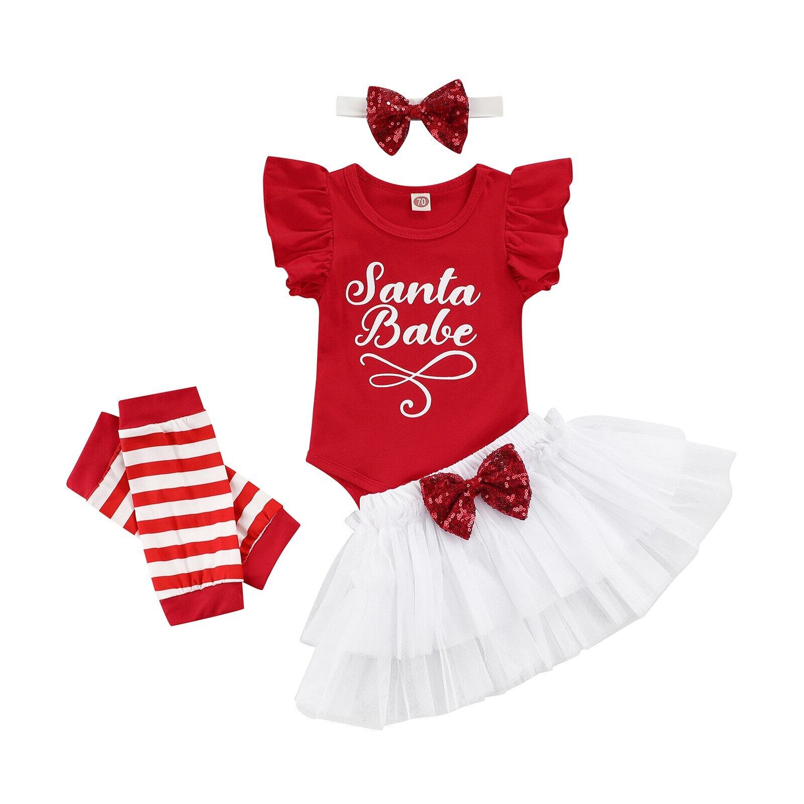 新作 生まれた赤ちゃんの女の子のクリスマスの服セットレタープリントフライスリーブロンパーストップスチュールスカートヘッドバンドレッグスリーブ4個クリスマス衣装
