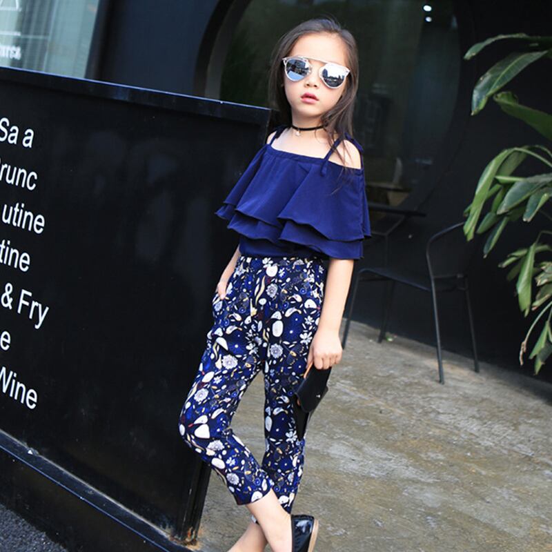 新作 夏の10代の女の子フラワーシフォンセット子供オフショルダートップスフローラルパンツキッズ衣装女の子服8 1214年