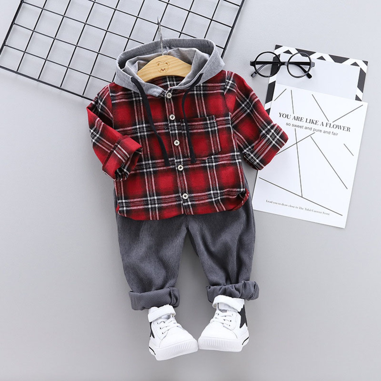 新作 幼児の秋の服の男の子は小さな綿のトラックスーツ2020格子縞のパーカースーツツーピースの子供たちの1歳の誕生日の衣装を設定します