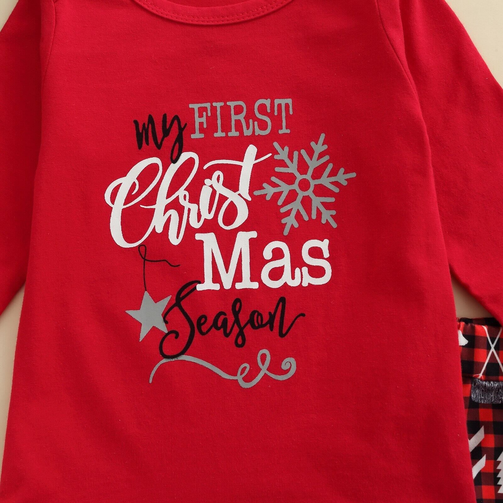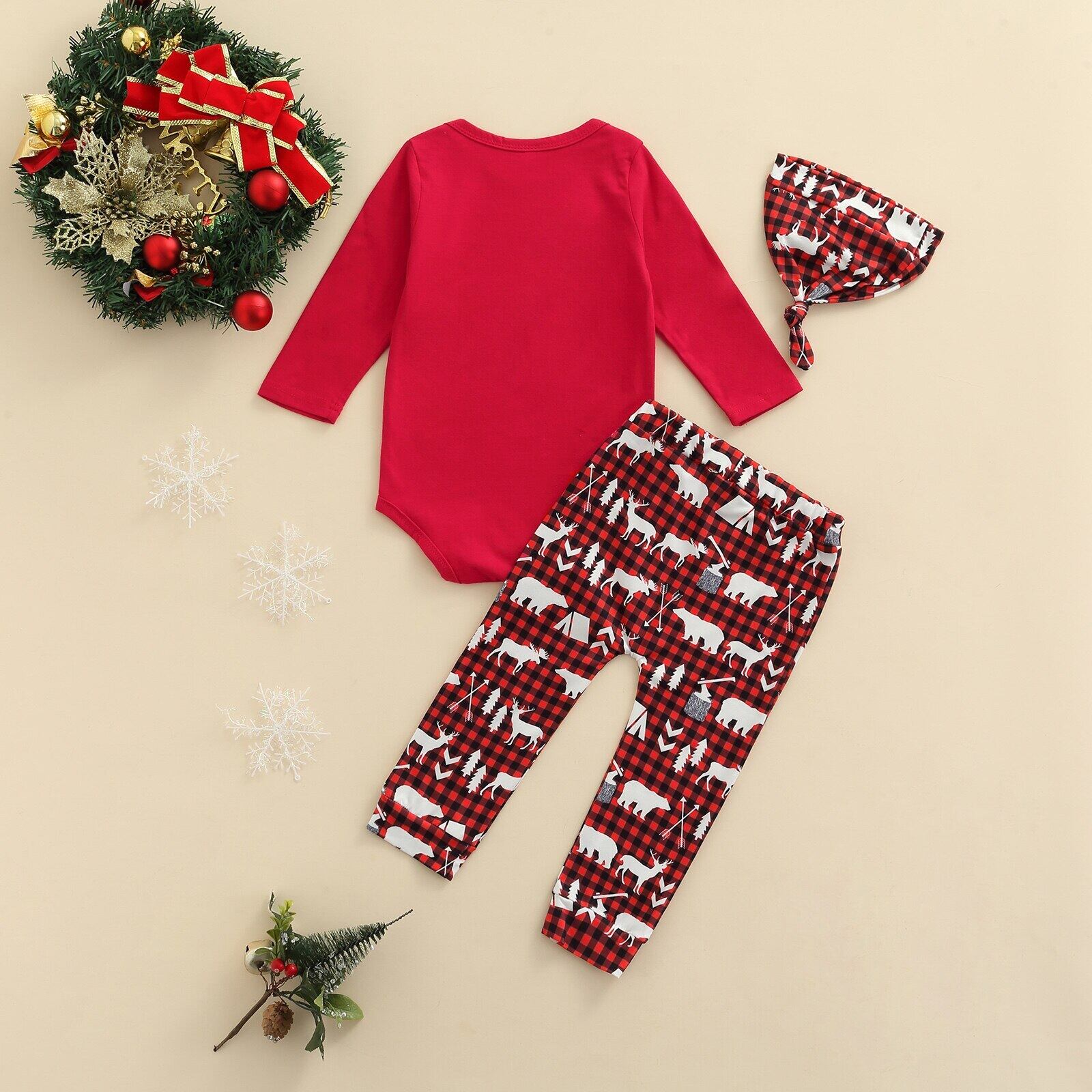 新作 3個生まれのクリスマス衣装赤ちゃんの女の子スノーフレークレタープリント長袖ラウンドネックプレイスーツ+チェック柄パンツ+結び目のあるキャップ