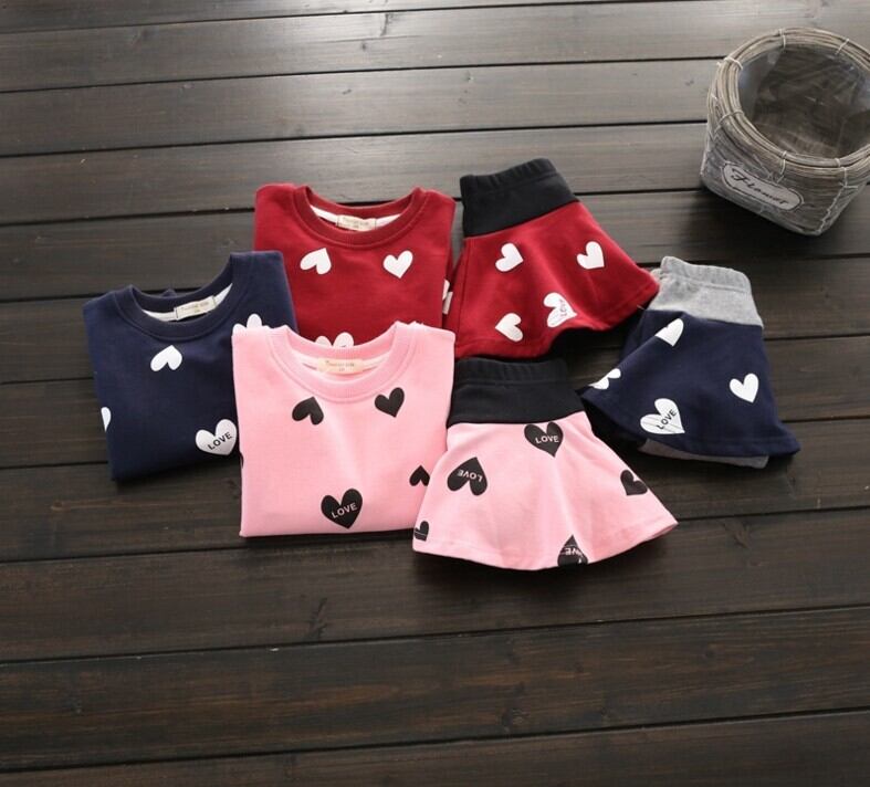 新作 春秋ベビーガールズセットハートプリントチルドレン長袖Tシャツトップス+スカート長パンツセット