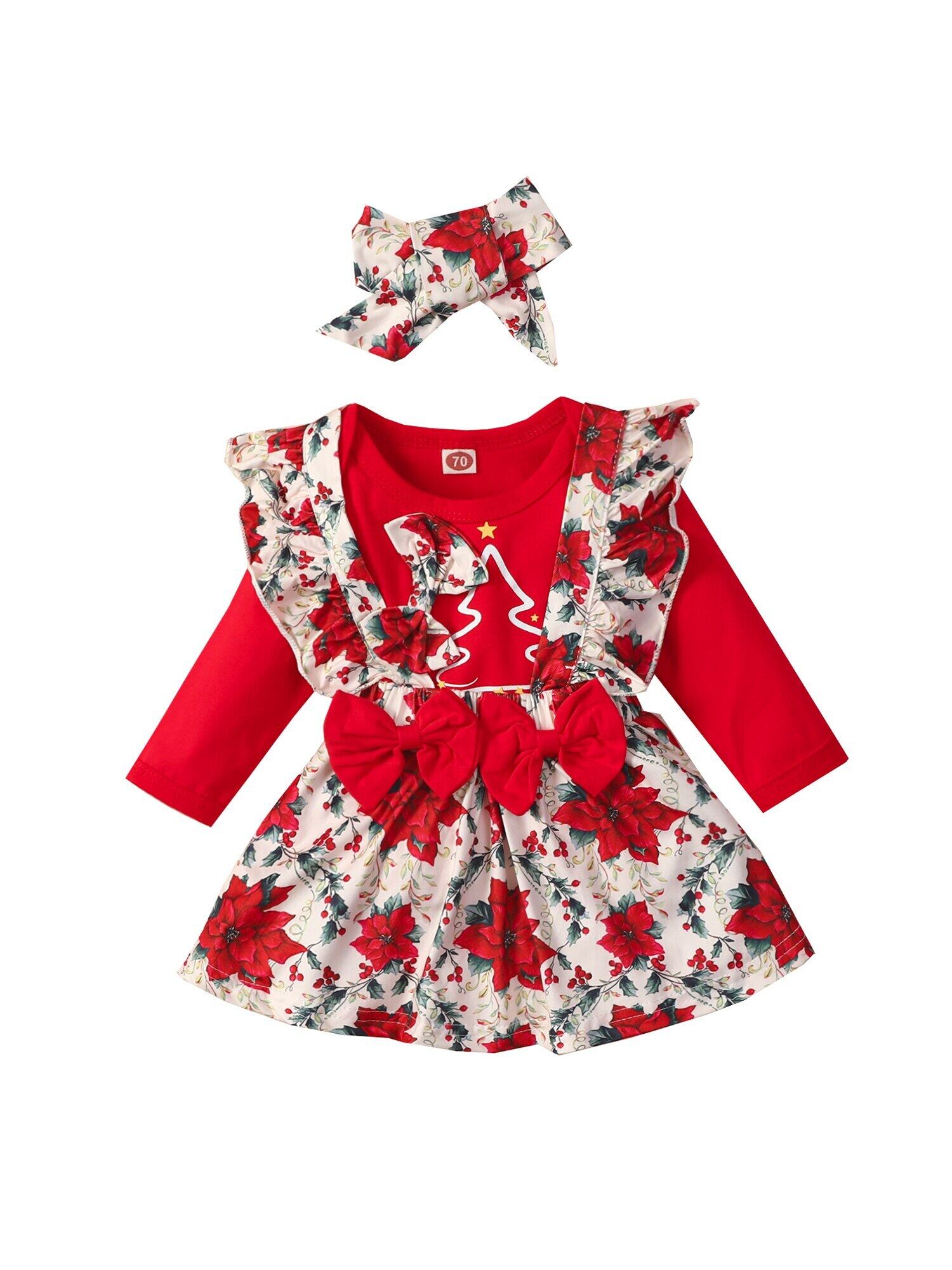 新作 ベビーマイファーストクリスマス衣装長袖レタープリントロンパース+ボウサスペンダースカート+カチューシャセット