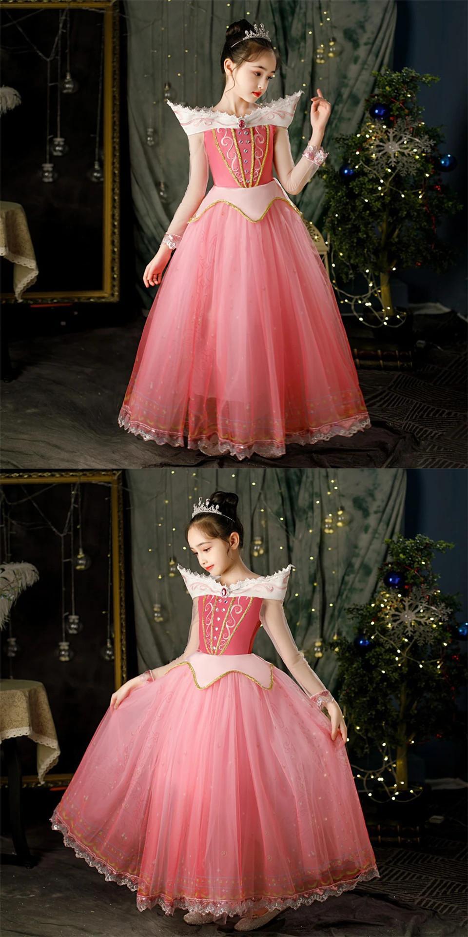 新作 2022年チャイルドオーロラドレス仮面舞踏会イブニングパーティーピンクの豪華なショルダーレスドレスの女の子