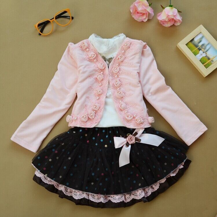 新作 キッズガールズフラワー3pcセットショートミニジャケットブラウスシャツレースツツスカートベビーガールズスーツセット子供服