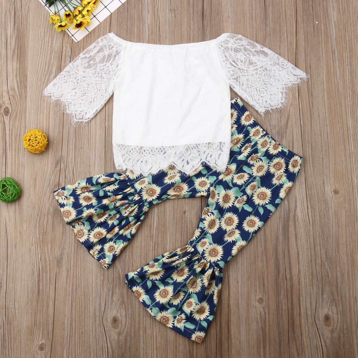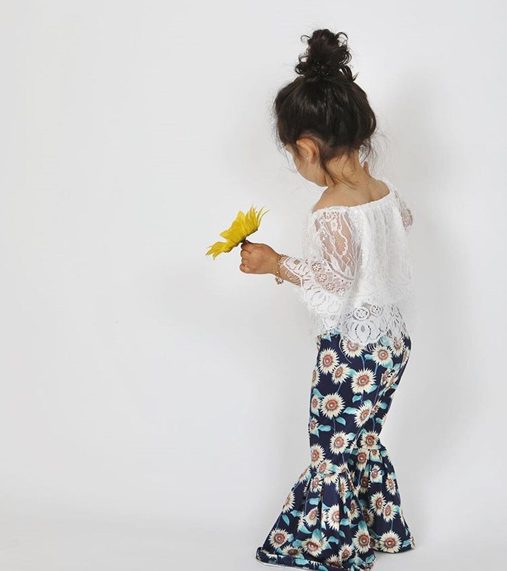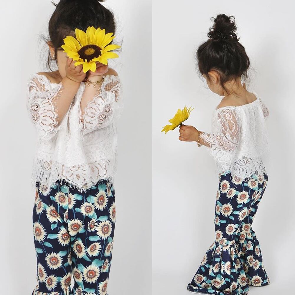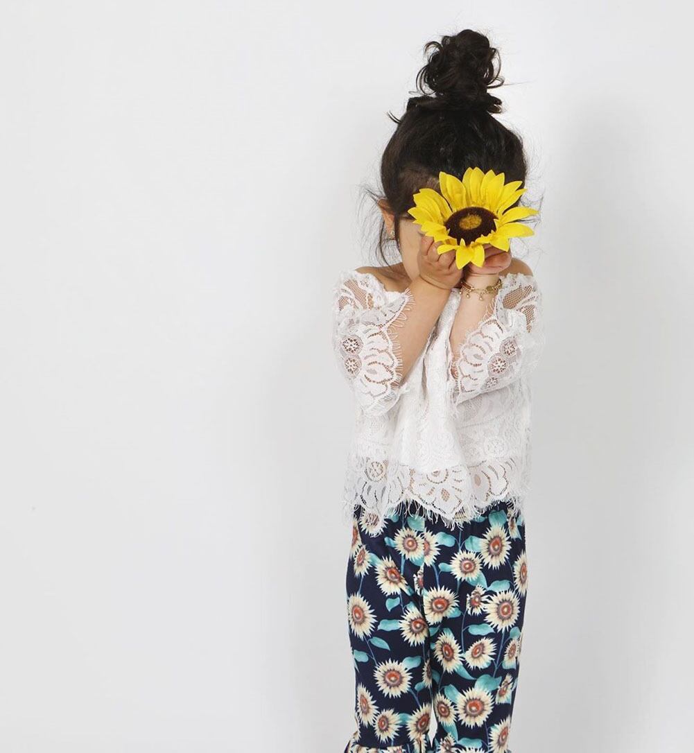 新作 1-6Yフラワー幼児キッドベイビーガールズセットホワイトレーストップスTシャツ+ヒマワリフレアパンツ衣装キッズ