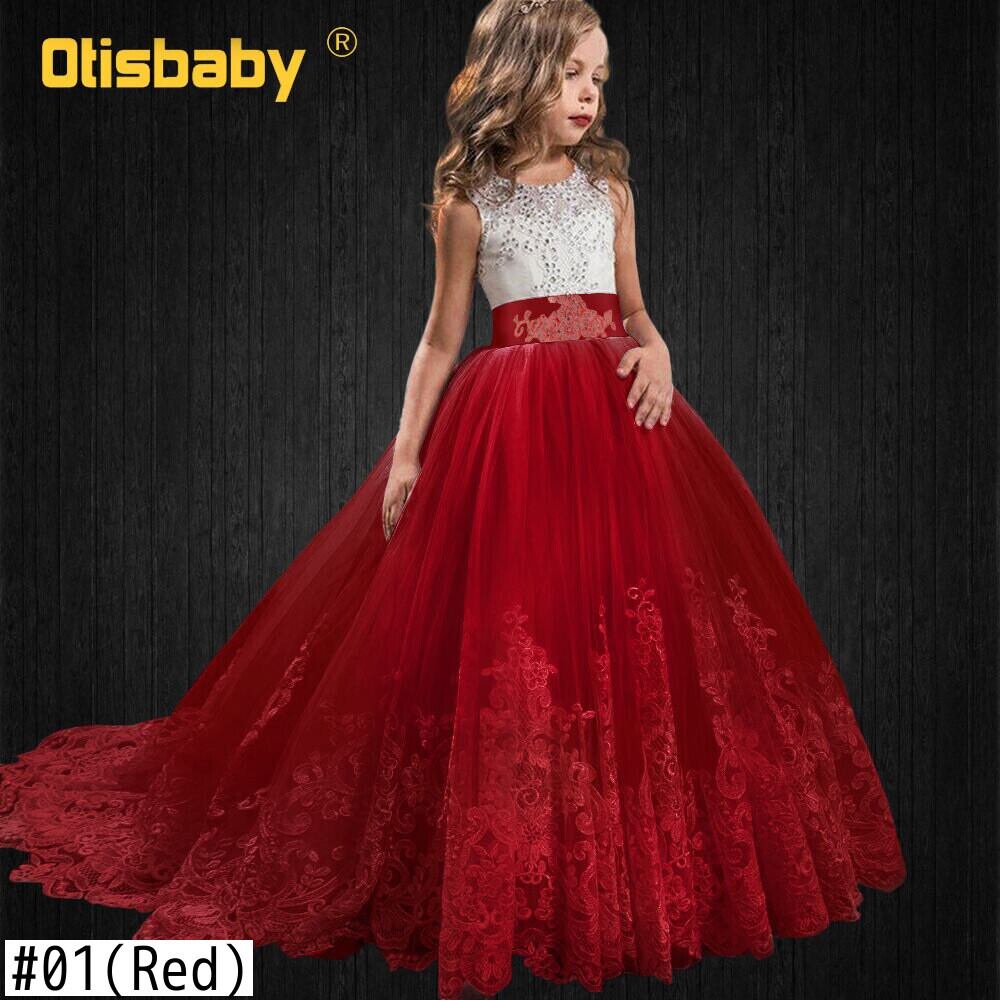 新作 キッズレッドドレスガールズロングテールウェディングドレスふわふわガールファーストコミュニオンドレスレースノースリーブロングイブニングドレス