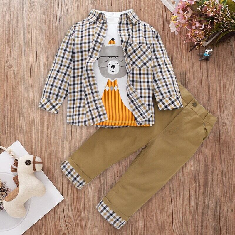新作 3pcs幼児春服リトルボーイセット小さな綿の格子縞のシャツトラックスーツスーツ子供1歳の誕生日の衣装