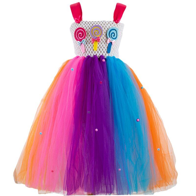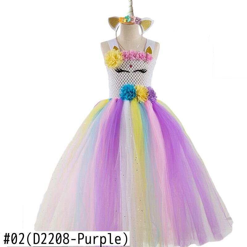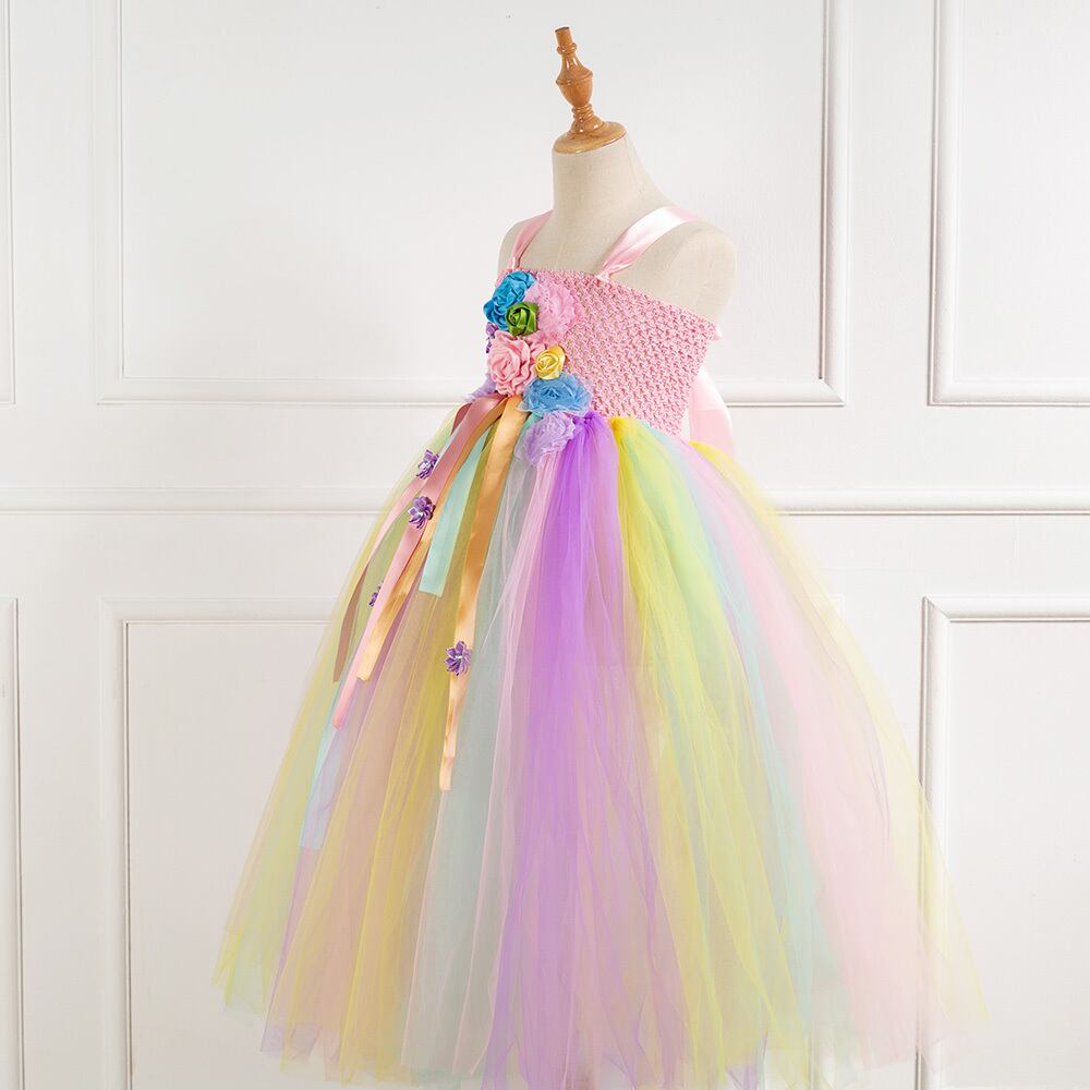 新作 ガールズユニコーンフラワーチュチュパーティードレスベビーキッズかぎ針編みチュールストラップリトルマーメイドリボン子供レインボードレスセット