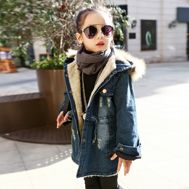 新作 Winter Girls Long Denim Jacket Plus Parka Teen Girl Fur Collar 2018 Hooded Coat Autumn Kids Thicken Outerwear 4 6 8 1012年
