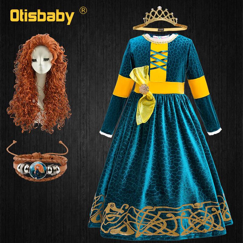 新作 ブレイブ変装子供女の子フルスリーブクイーンメリダドレス+アクセサリーファンシーガール誕生日パーティー