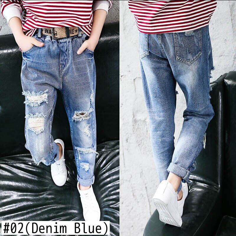 新作 キッズジーンズ破れたスキニージーンズベビーガール冬秋ロングブロークンパンツボタンフライデニムパンツチルドレンジーンズガールズ