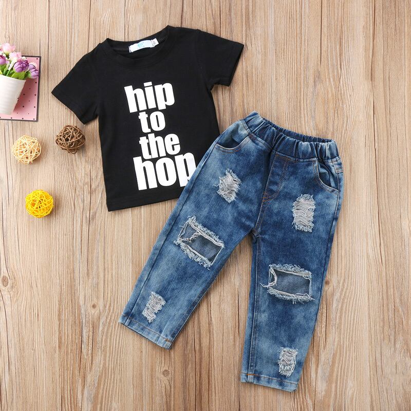 新作 2019幼児キッズ男の子服黒Tシャツトップ+デニムパンツ破れたジーンズ衣装セット子供服
