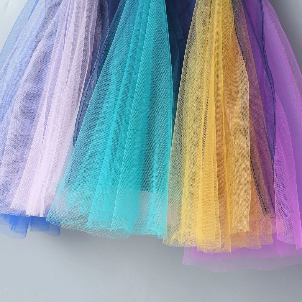 新作 女の子のドレス子供ノースリーブレインボードレスチュチュドレスキッズチュールストラップドレス夜会服パーティー春のキッズレース