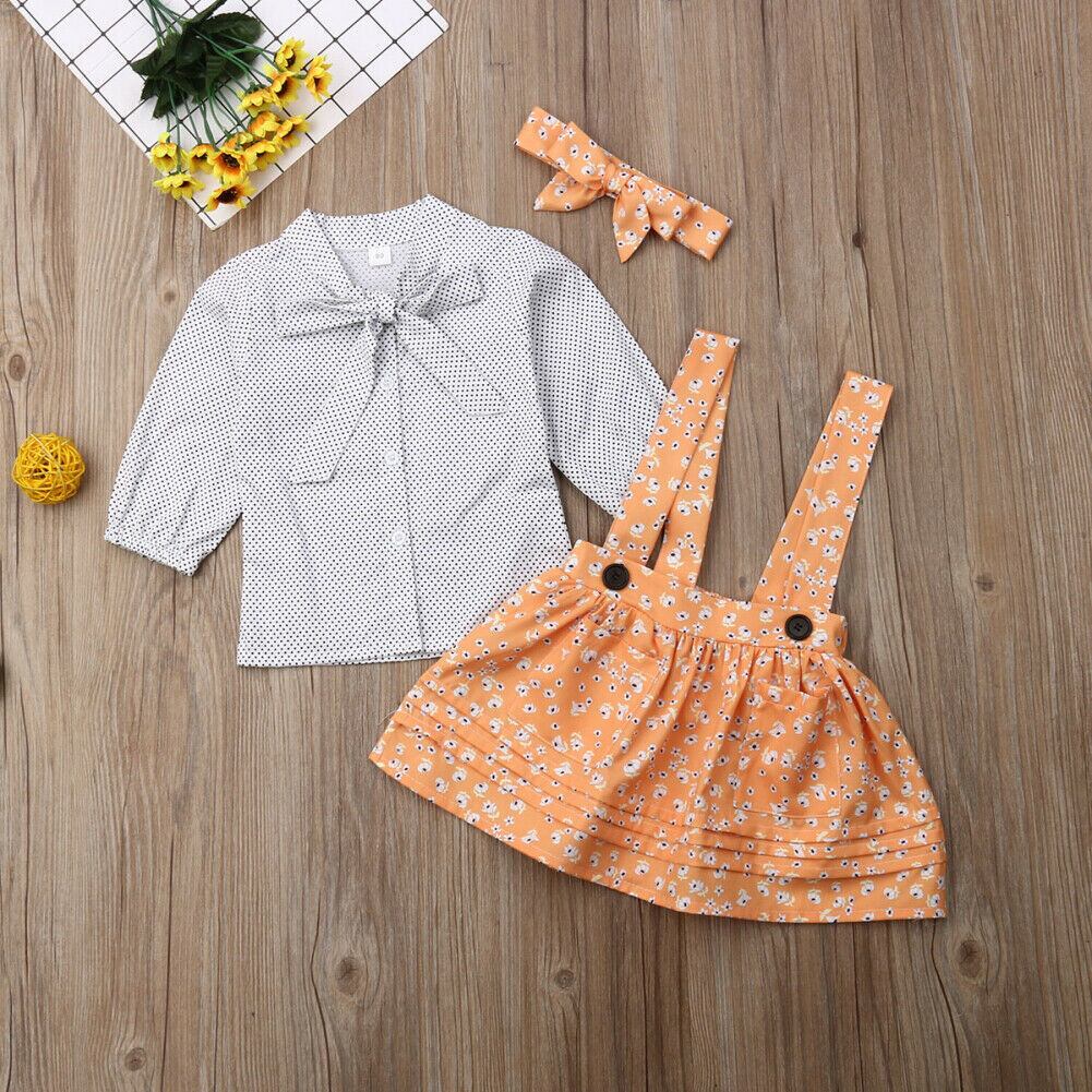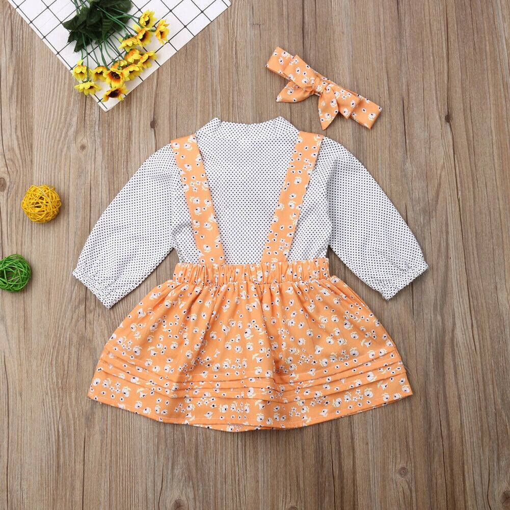 新作 6M-5Y幼児ベビーキッドガールズセットボウドットTシャツ+フラワースカートオーバーオール+ヘッドバンド衣装キッズ秋の春