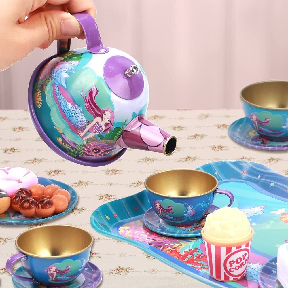新作 キッズティーパーティーセットリトルガールズマーメイドギフトふりおもちゃティンティーセット、ティータイムキッチンふりプレイティーセットおもちゃ