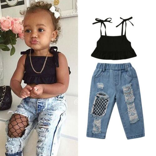 新作 米国幼児キッズベビーガールズベストサスペンダートップス+破れたフィッシュネットジーンズパンツ衣装服