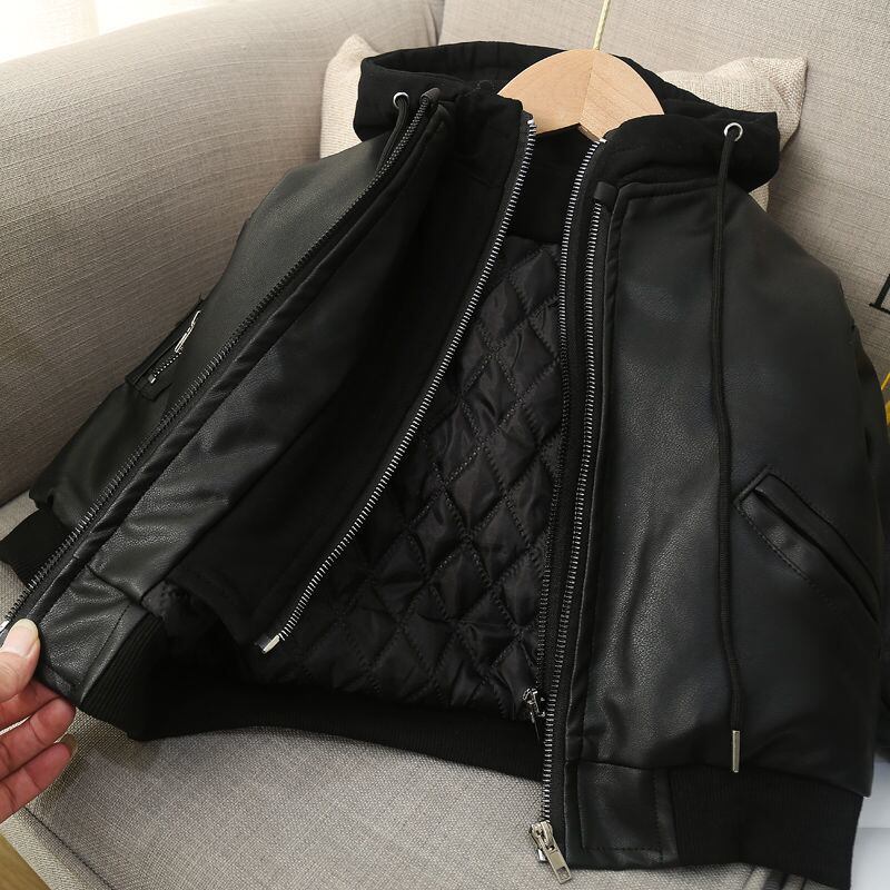 新作 2 3 4 56歳子供幼児男の子女の子フード付き厚いジッパーバイカーレザージャケット冬暖かい子供白衣衣装アウター