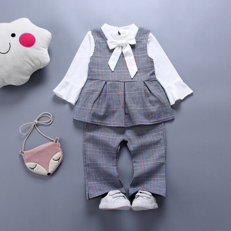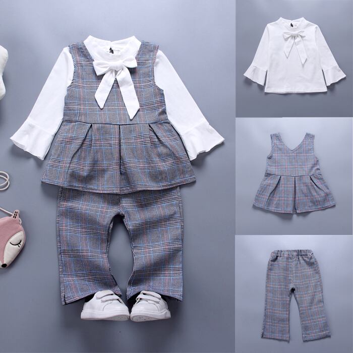 新作 6M-4Y幼児キッドベイビーガールセットマルスーツチェック柄ベストチュニックボウブラウスパンツ秋の春の装い