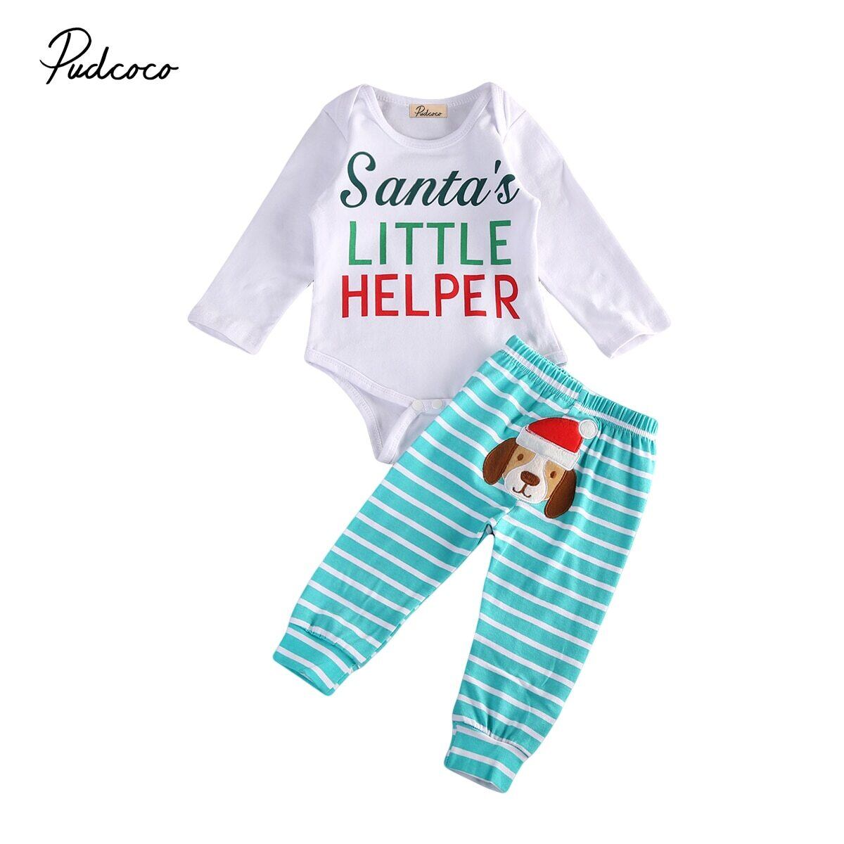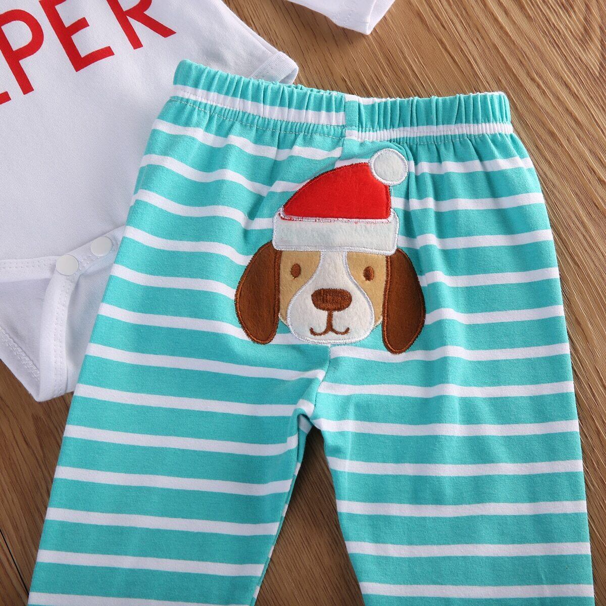 新作 2019クリスマスベビー服2pcセット生まれのベビーボーイガールロンパースプレイスーツ+かわいい犬のプリントストライプパンツ秋のクリスマスベビー服