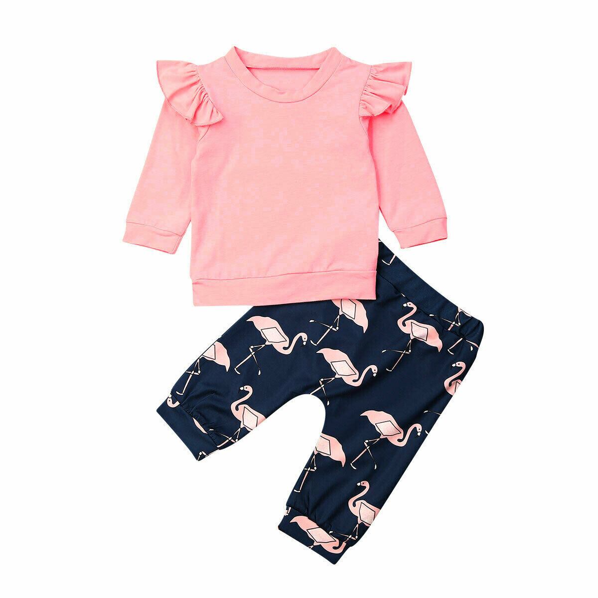 新作 0-18M生まれの幼児の女の赤ちゃんセットフリル長袖Tシャツ漫画フラミンゴパンツ秋春の女の赤ちゃん