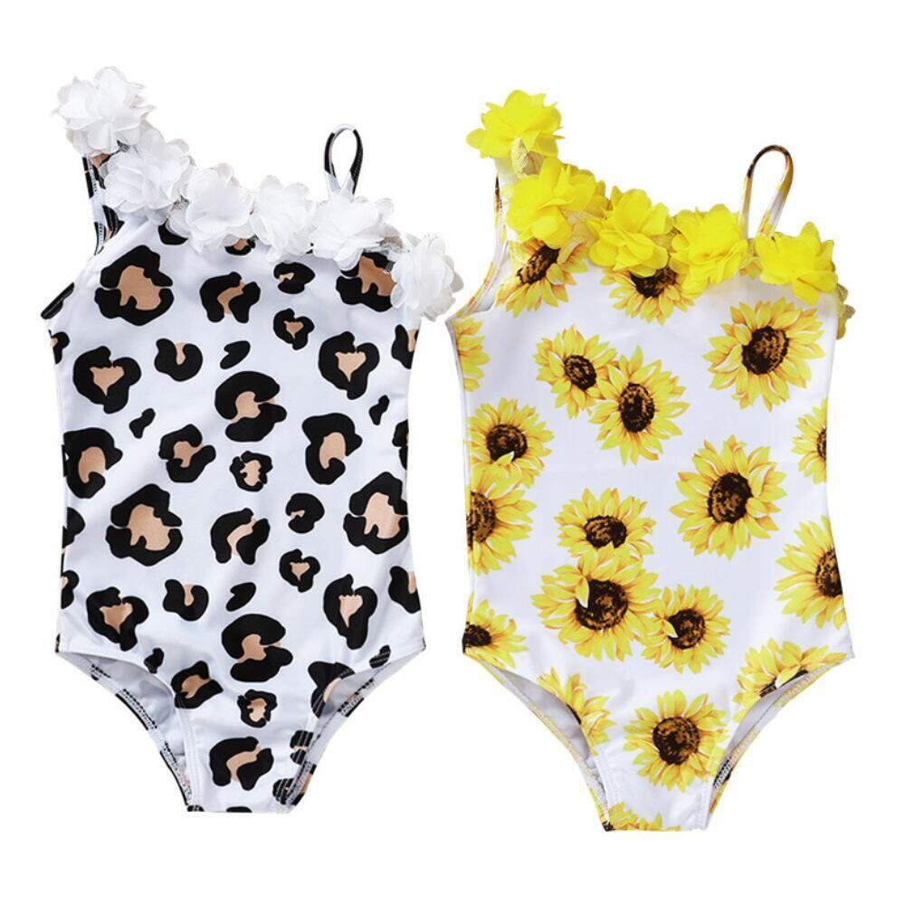 新作 0-5Yサマーベイビーキッズガールズビキニフリルワンショルダーヒョウ/ヒマワリプリントノースリーブビーチウェア幼児水着