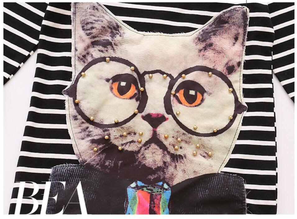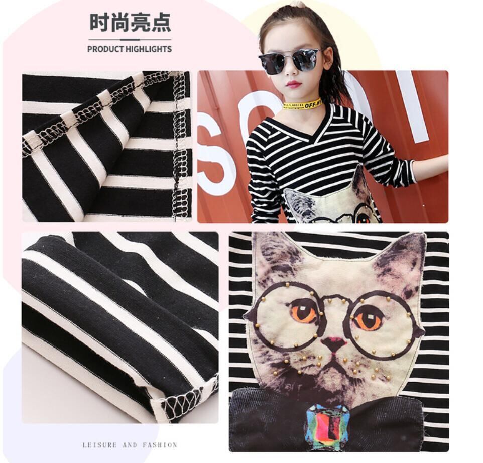 新作 ガールドレスフクロウ印刷長袖ブラックグレーストライプTシャツトップガールズコットン10代ドレスvestidosInfantis服