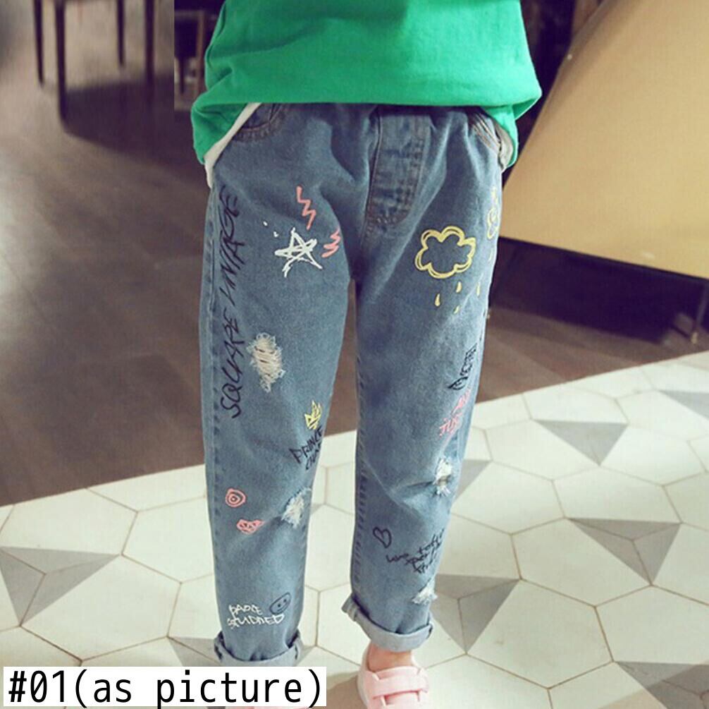 新作 春秋キッズクラウンレターラブハートプリントジーンズデニムパンツガールズホールパッチジーンズ子供パンツ