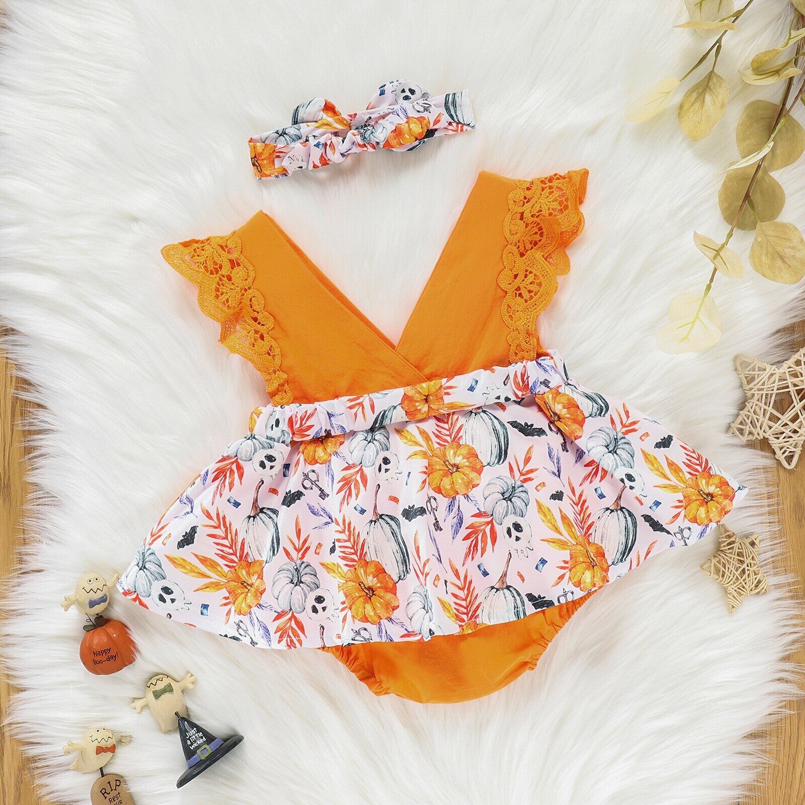 新作 Ma&Baby0-24MベイビーガールロンパースパンプキンVネックジャンプスーツレースフリルサンスーツ+ヘッドバンドパーティー