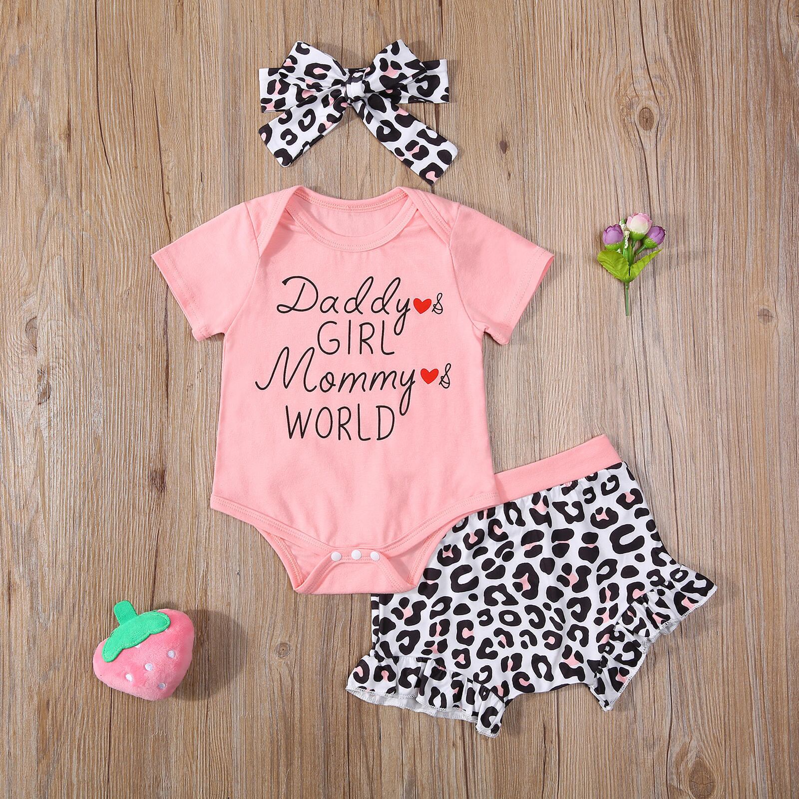 新作 0-18M夏の赤ちゃんの女の子の服セット3pcsレター半袖ロンパースヒョウショーツヘッドバンド