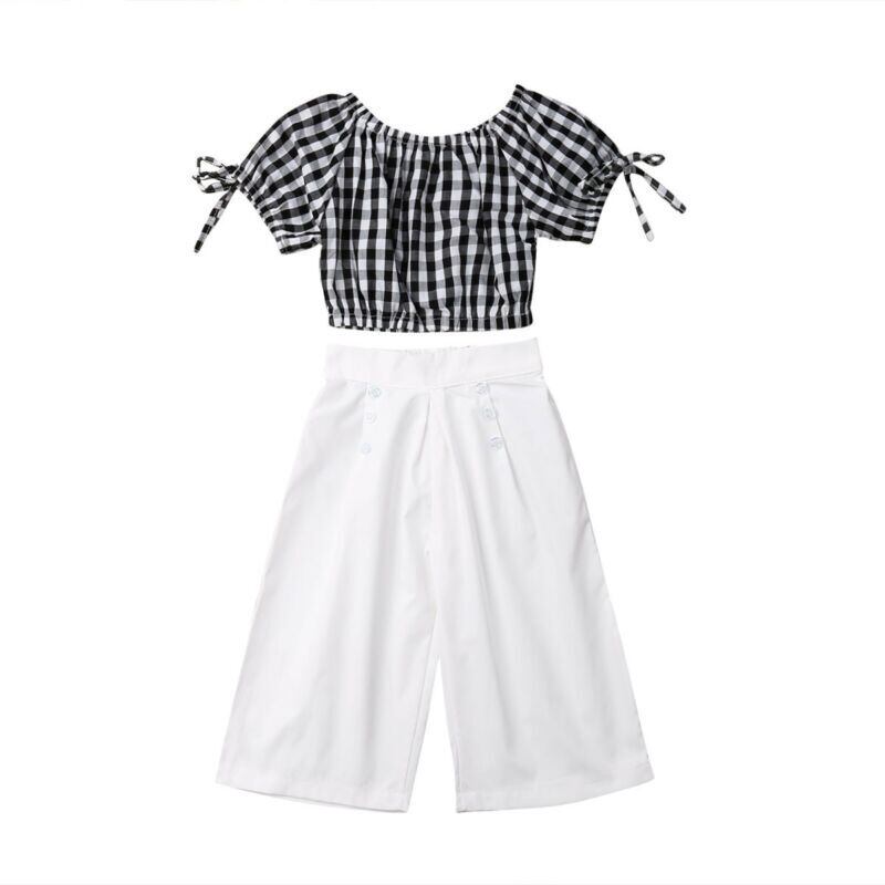 新作 英国幼児ベビーガールズキッズトラベルホリデーチェック柄オフショルダーパフスリーブTシャツホワイトワイドレッグパンツ夏服セット