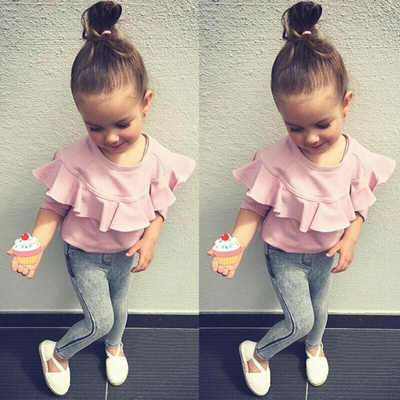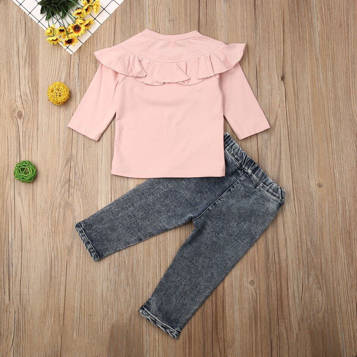 新作 キッド生まれのベビーガールコットン長袖デニムパンツ冬服ピンクロータスリーフカラートップベビーセット