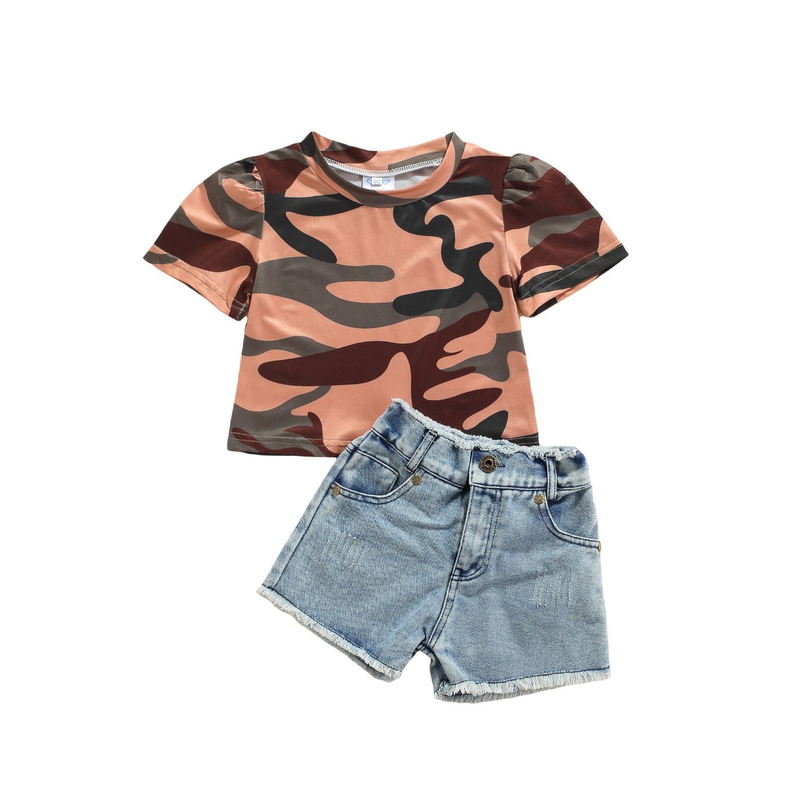 新作 Ma&Baby1-6Yチャイルドキッドガールズ洋服セットカモフラージュプリントTシャツウエストデニムショートパンツ夏服DD43