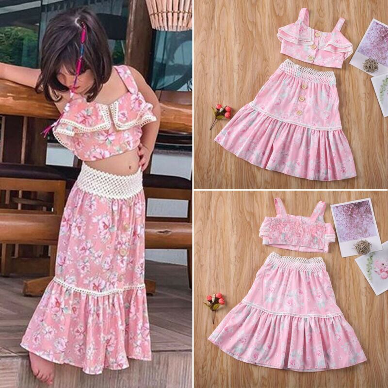 新作 幼児キッド女の赤ちゃん夏服クロップベストトップロングドレス花柄衣装1-6Y