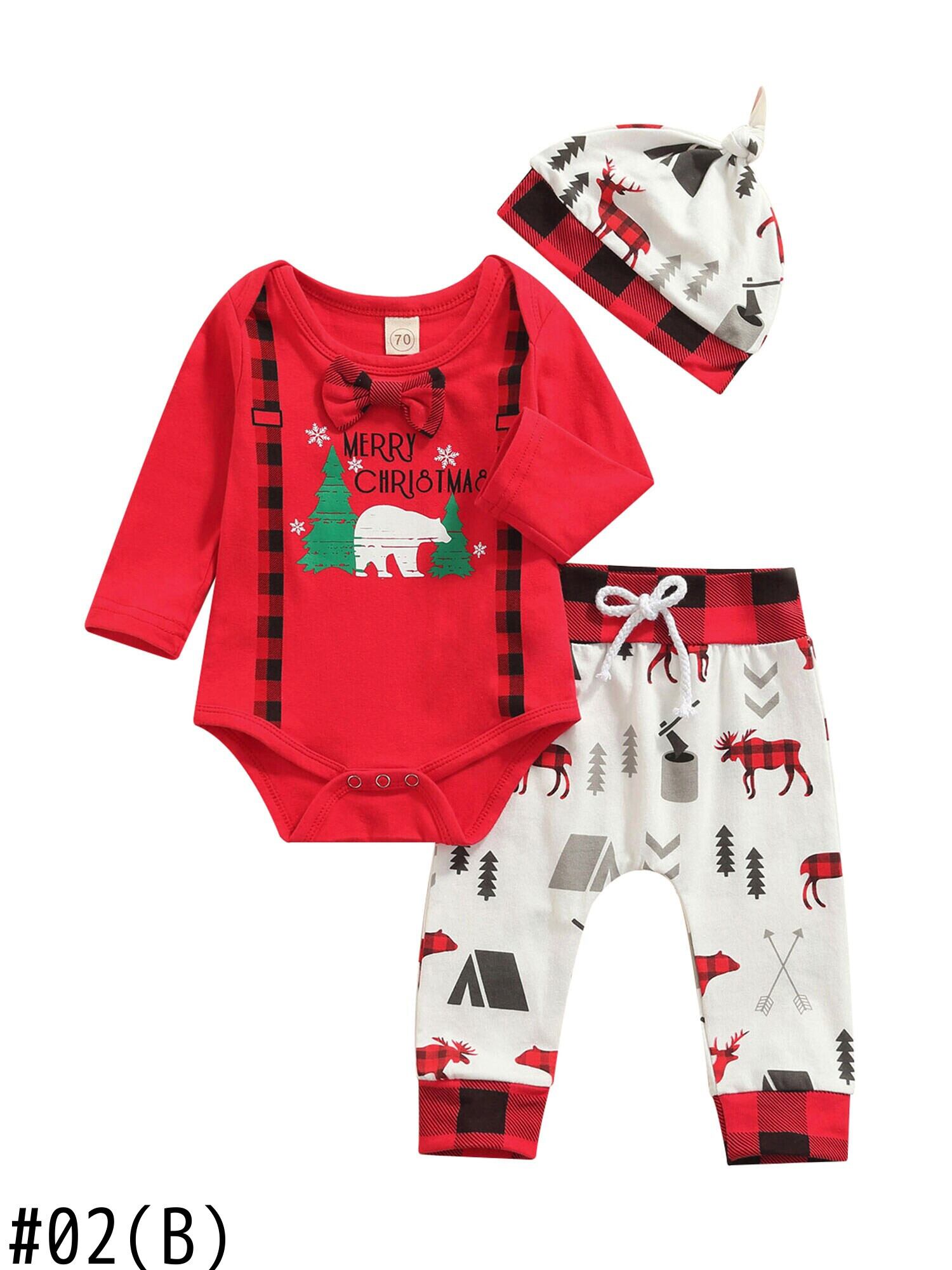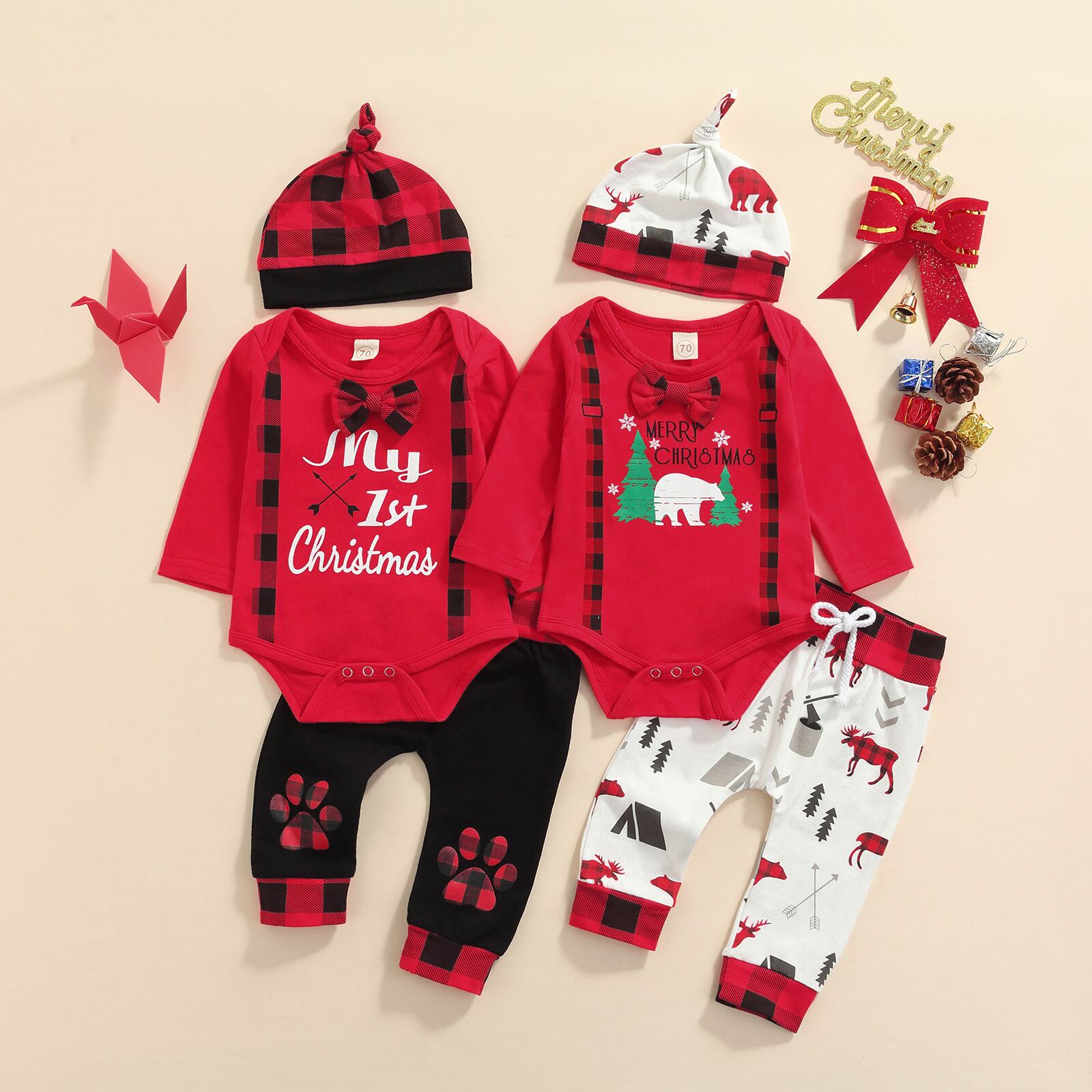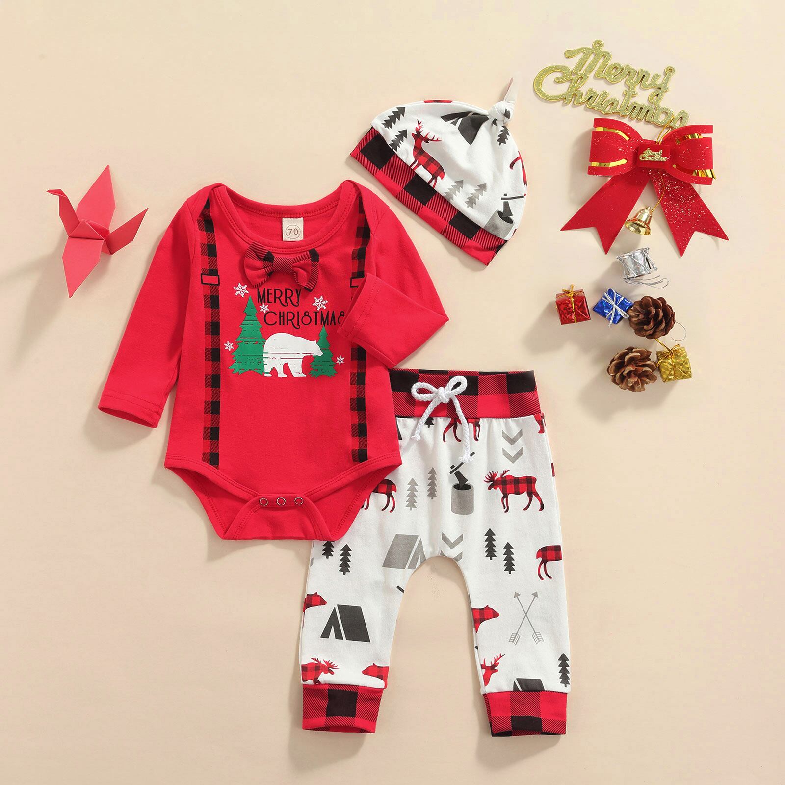 新作 生まれた赤ちゃん男の子クリスマス服セットコットンレタープリントロンパーストップロングパンツ帽子春秋赤ちゃんクリスマス衣装0-18M