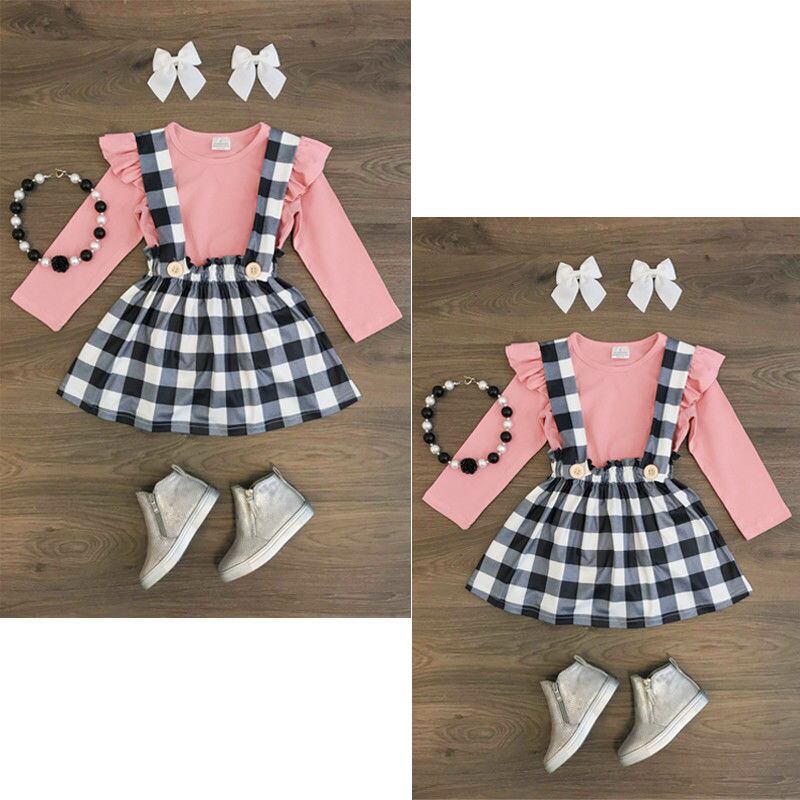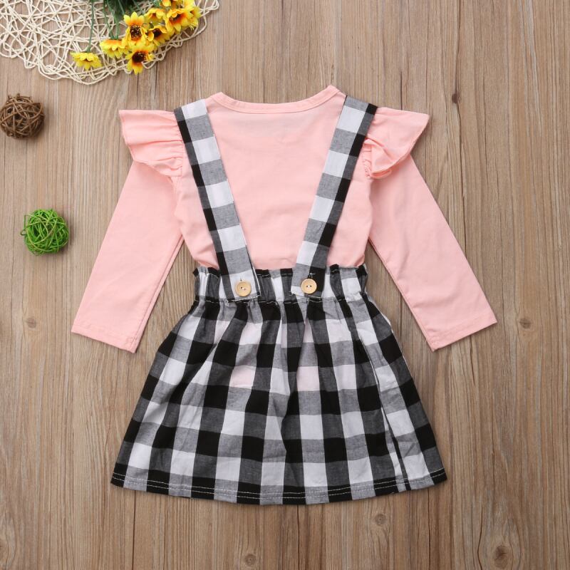 新作 2PCSベビー幼児ガールズスウィートピンク長袖Tシャツチェック柄サスペンダースカートパーティードレス衣装服1-5Y