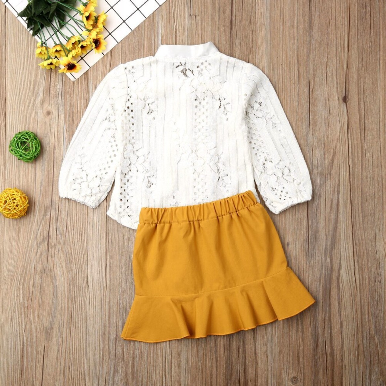 新作 幼児の女の赤ちゃんの服レース中空蝶結びネクタイトップスシャツ+黄色のフィッシュテールスカートドレス衣装セット