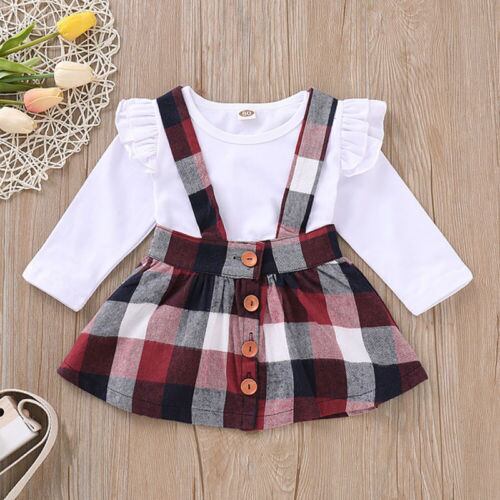 新作 幼児キッドベイビーガールホワイトトップTシャツ+チェック柄ボタンスカートドレス衣装服1-5年