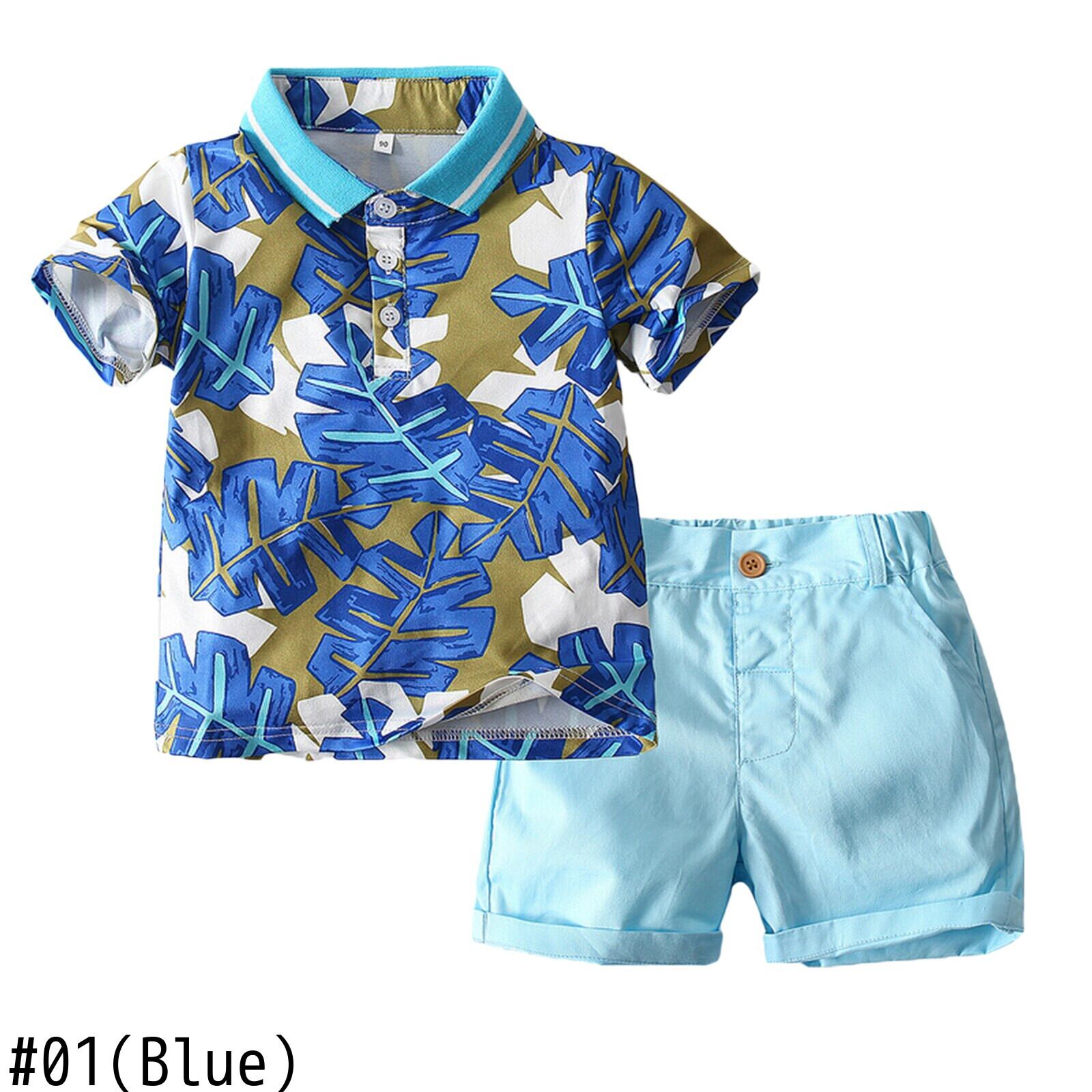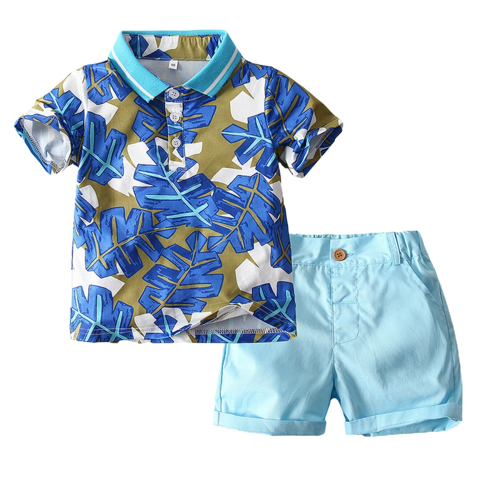 新作 夏の2ピースキッズスーツセットリーフプリントターンダウンカラー半袖トップス+伸縮性ウエスト無地ショーツボーイズブルー