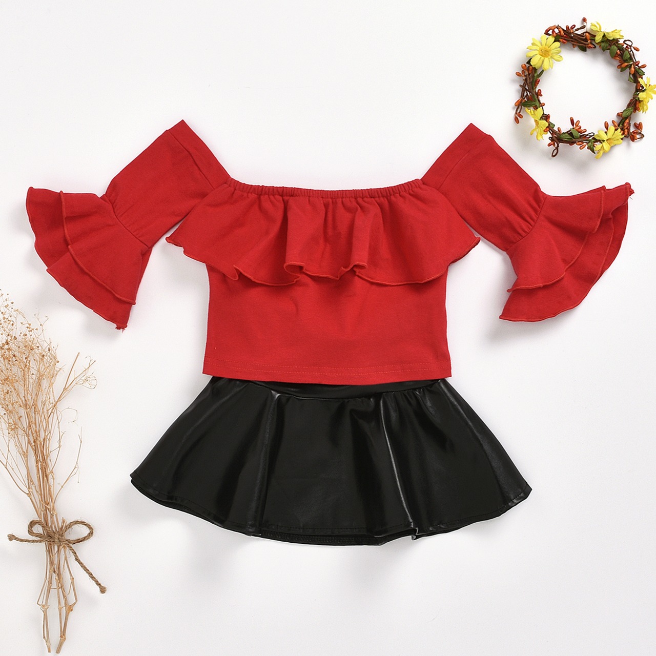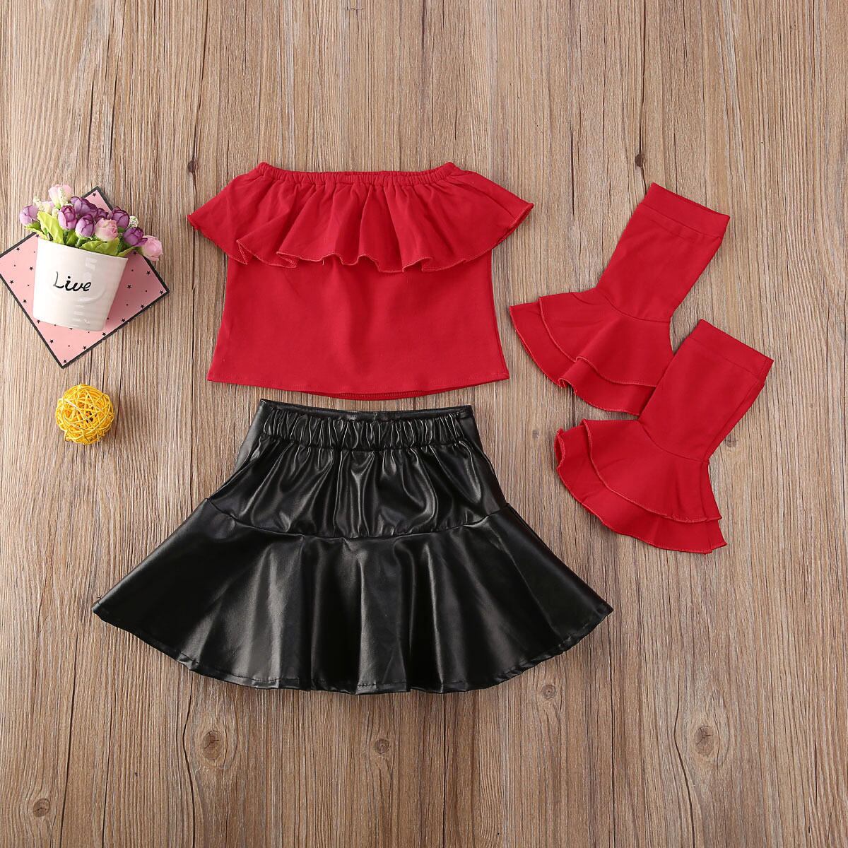 新作 1-5Y幼児ベビーキッドガールズセットレッドフリルオフショルダートップス+ Puレザーブラックスカート子供用夏