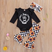 新作 ベビーガールズ洋服セット長袖レタートップスフリル+ひまわり柄フレアパンツ+カチューシャ春・秋