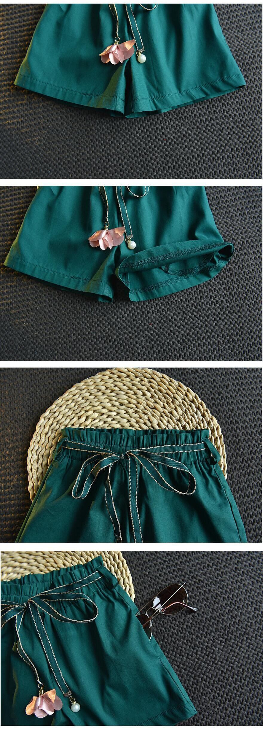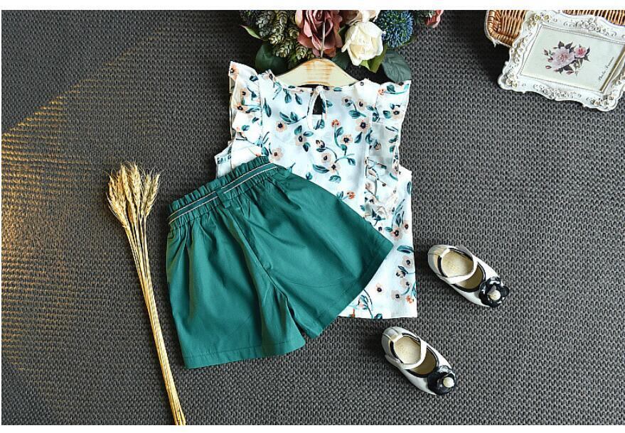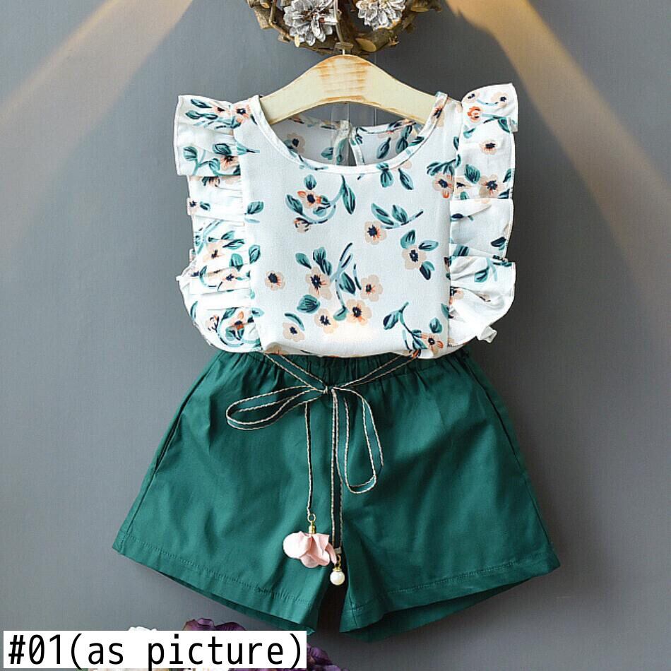 新作 ガールズセットサマーフローラルノースリーブシフォントップTシャツソリッドショーツ2PCSベビーキッズスーツ子供服2-6年 夏物 ブルマー 花柄 ソリッドカラー