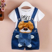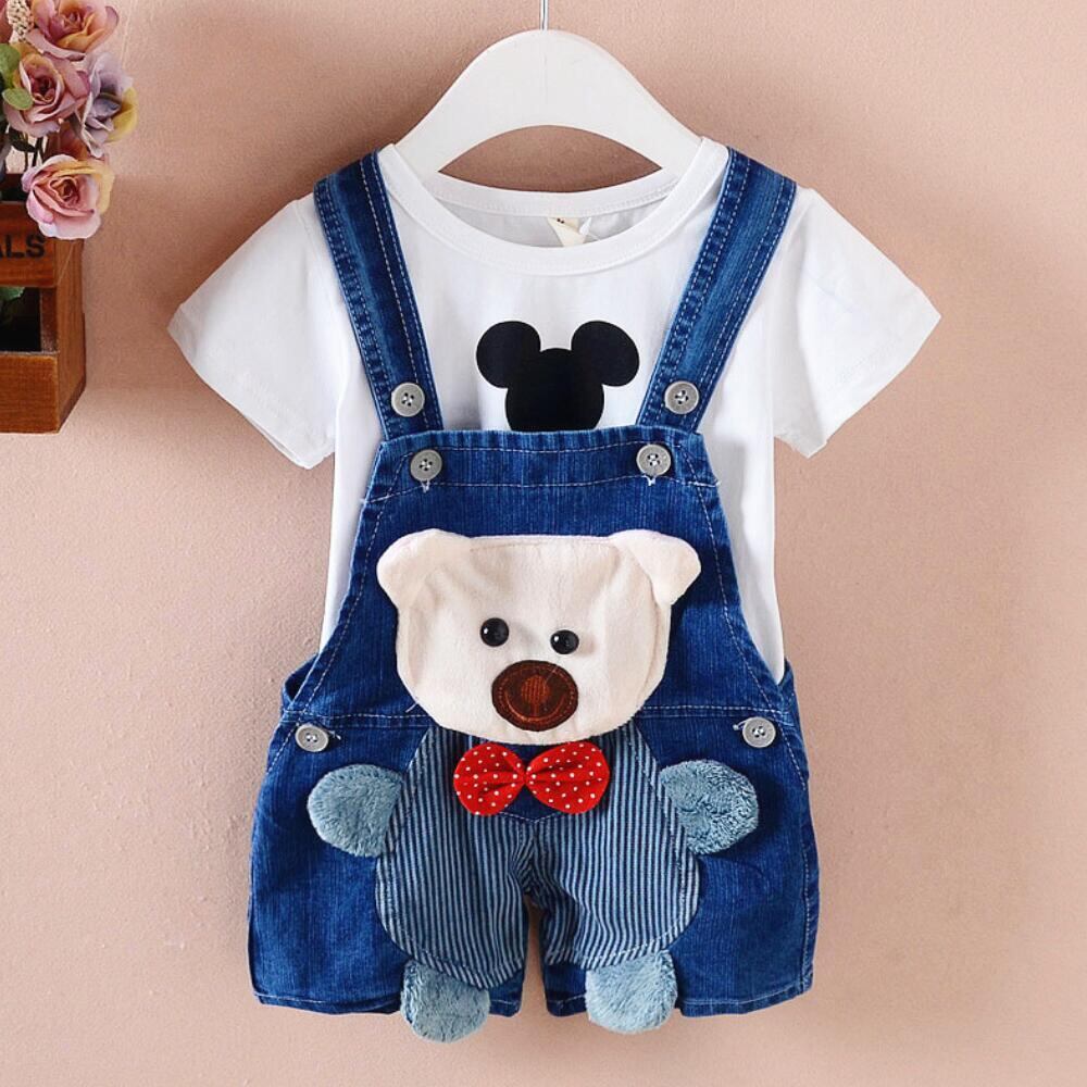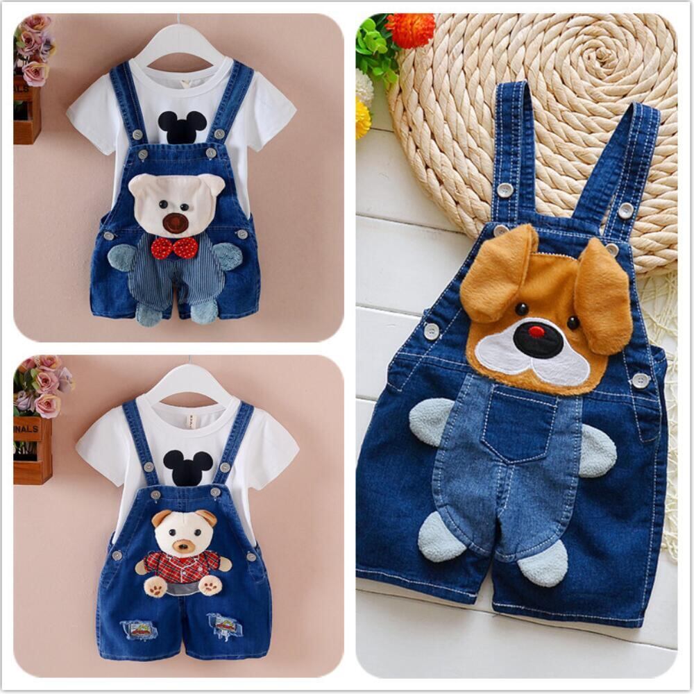 新作 夏のよだれかけパンツキッズベビーボーイズ服かわいいクマジーンズショーツ幼児幼児男の子ガールパンツ漫画デニムオーバーオールダンガリー