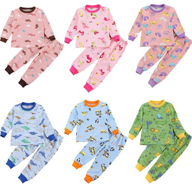 新作 キッズボーイズガールズパジャマスーツ秋春長袖ラウンドネックウォームトップスカートン柄ロングパンツ秋春