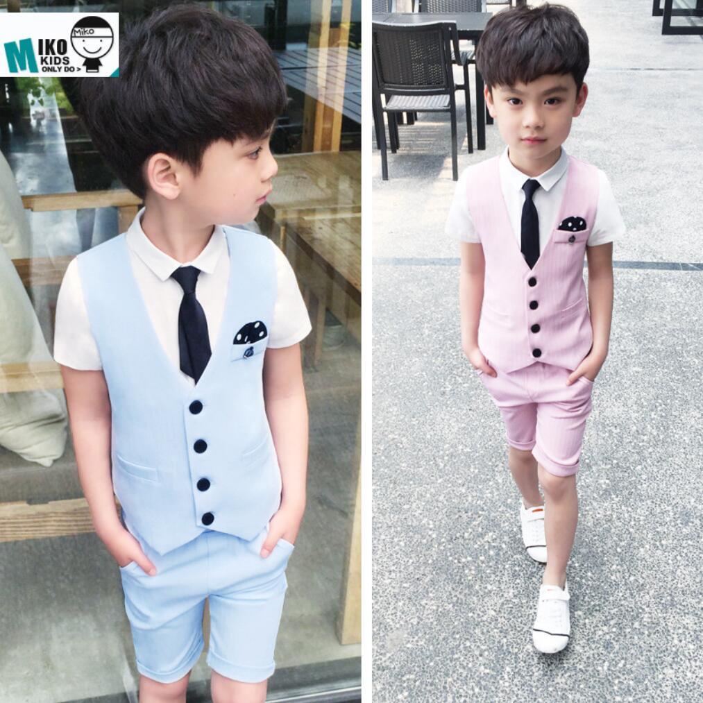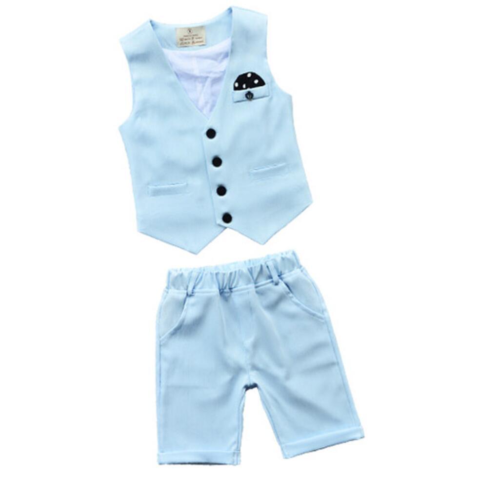新作 ボーイズブレザーセットピンク/ブルーベストショーツシャツ4pcsスーツウェディングマルパーティーキッズベビーボーイセットバースデー ブルマー
