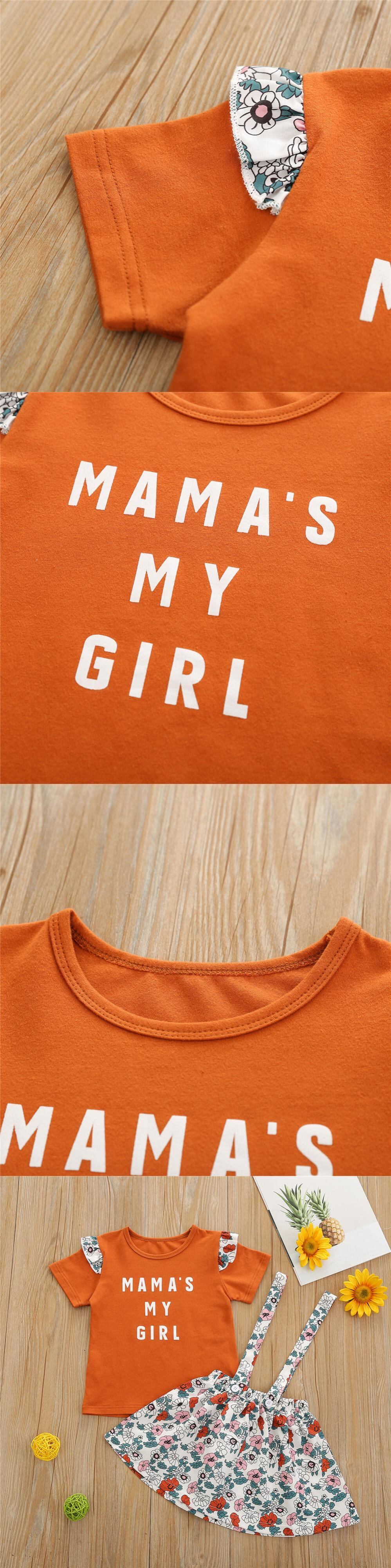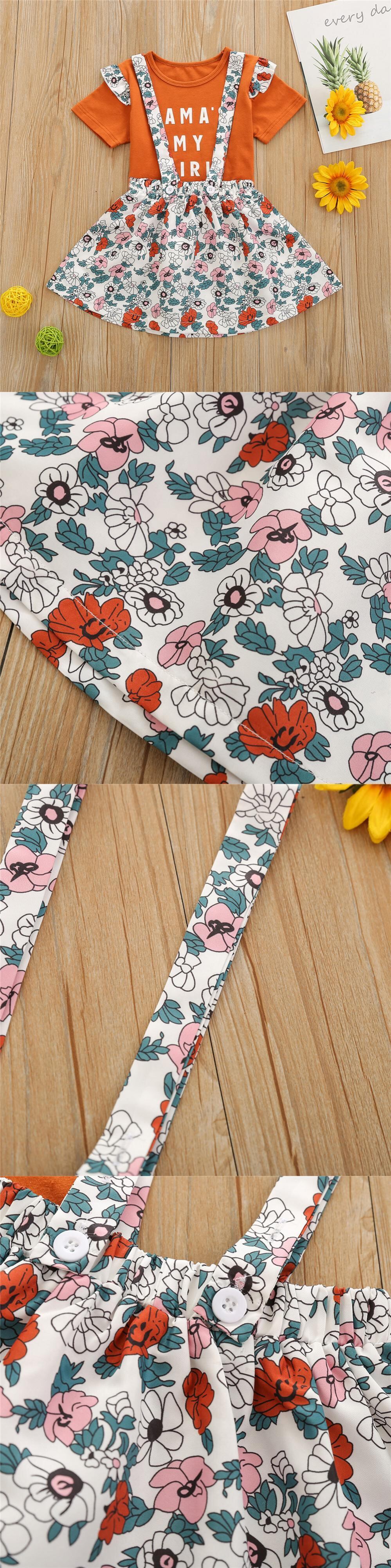 新作 1-6T幼児用ベビーガールズ洋服セットキッズレタープリント半袖Tシャツフリル+フローラル/ヒョウサスペンダースカートスーツ