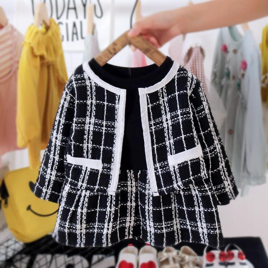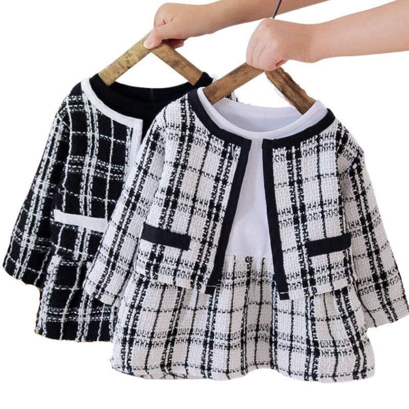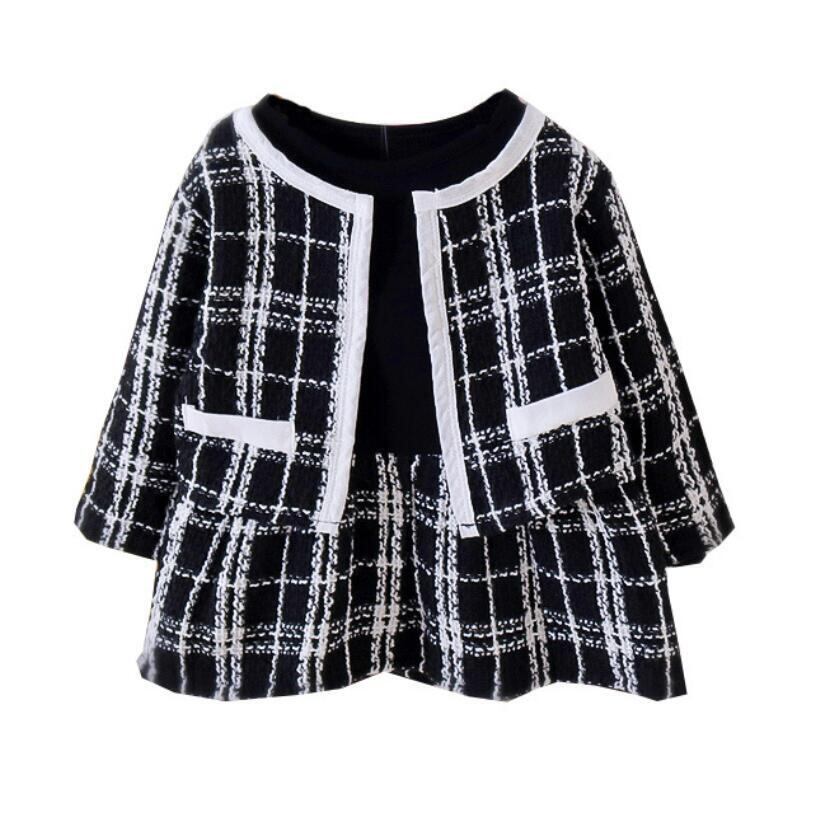 新作 生まれた服2021秋冬赤ちゃん女の子服グリッドコート+ドレス2pcs衣装キッズスーツ子供幼児ドレスクロークセット