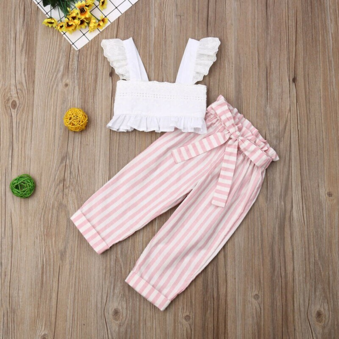 新作 2PCS幼児の女の子ホワイトレーススリングクロップトップ+ピンクストライプパンツレギンス衣装服セット年齢1-6Y